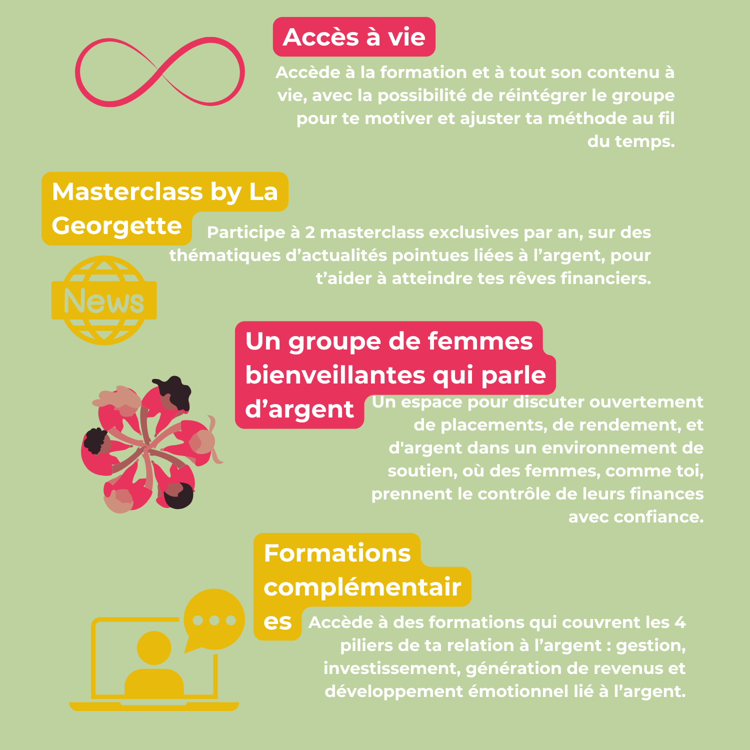 Le but de cette formation est de normaliser les échanges autour de l’argent entre femmes, mais tout est facultatif. Les lives et le groupe d’entraide sont des espaces protégés, où la confidentialité et le respect sont essentiels. Tu es libre de partager ce que tu veux, quand tu veux.