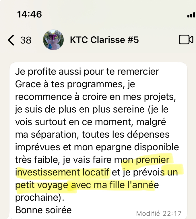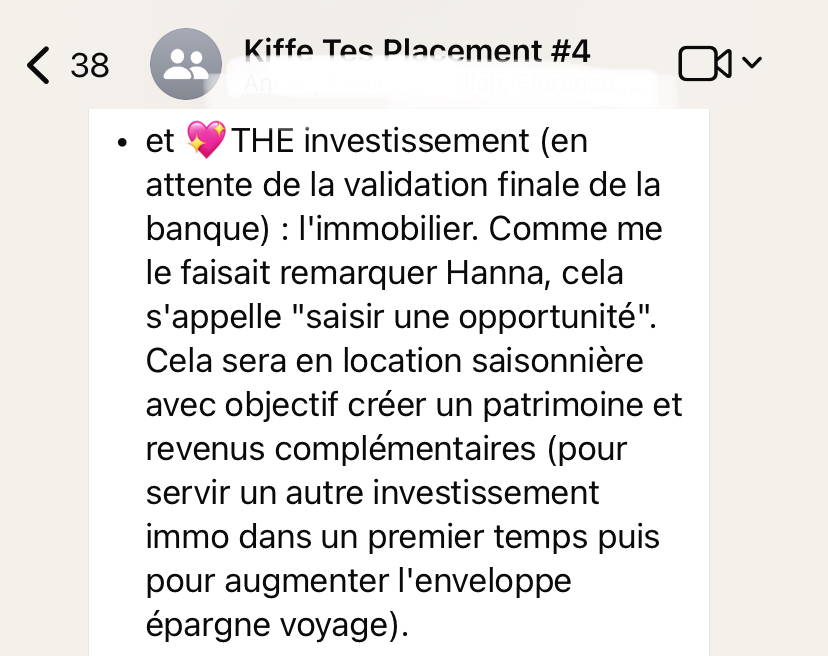 Ce que m’a apporté Kiffe Tes Placements, c’est une méthode de gestion financière claire et adaptable à mes objectifs et à mon mode de vie. Et je me sens en contrôle. Cette formation m’a donné les clés pour prendre des décisions éclairées pour l’avenir de ma famille, et surtout, pour investir de manière stratégique dans des actifs qui me procurent du plaisir à gérer.