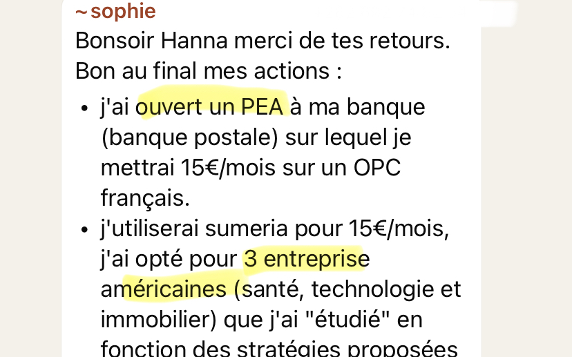 Grâce à ces investissements, j’ai réalisé mes rêves les plus fous : des voyages magnifiques, l'achat et la rénovation de mon appartement, et ma transition professionnelle, qui me permet désormais de travailler 4 jours par semaine, tout en profitant pleinement de ma petite fille de 1 an !