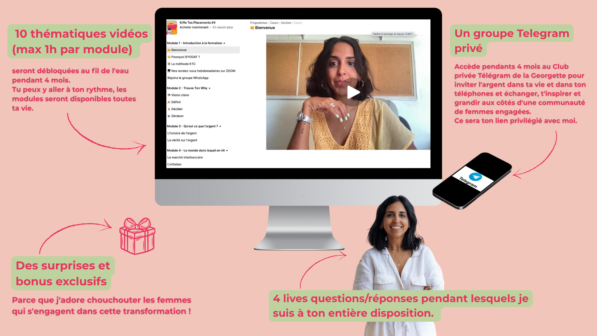Dès ton inscription, tu accèdes à la plateforme de formation ainsi qu’au groupe privé pour échanger avec moi et les autres femmes du groupe. Chaque semaine, tu débloqueras un nouveau module pour Kiffer tes placements.