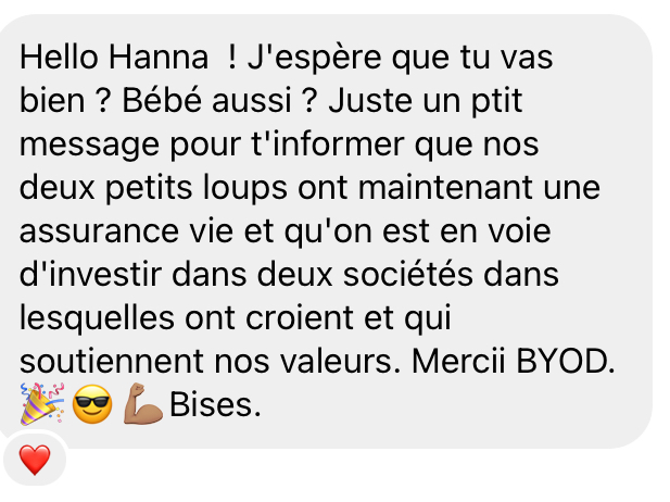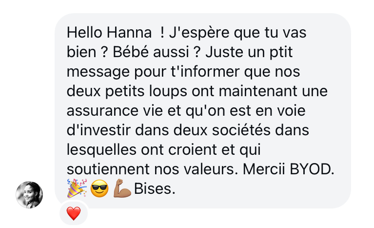 Après avoir fait Kiffe tes comptes et Kiffe tes placements, ma relation personnelle à l’argent à évolué, celle de mon mari, et celle de notre foyer aussi. Nous voyons l’argent comme un moyen et nous y mettons beaucoup moins d’émotions. Nous avons plaisir à parler d’argent et d’investissement et nous savons qu’à l’avenir, avec nos enfants, ce ne sera plus un tabou. Nous allons poursuivre notre cheminement, mais ce qui est certain, c’est que les formations d’Hanna ont véritablement et incontestablement changé nos vies sur le plan financier.