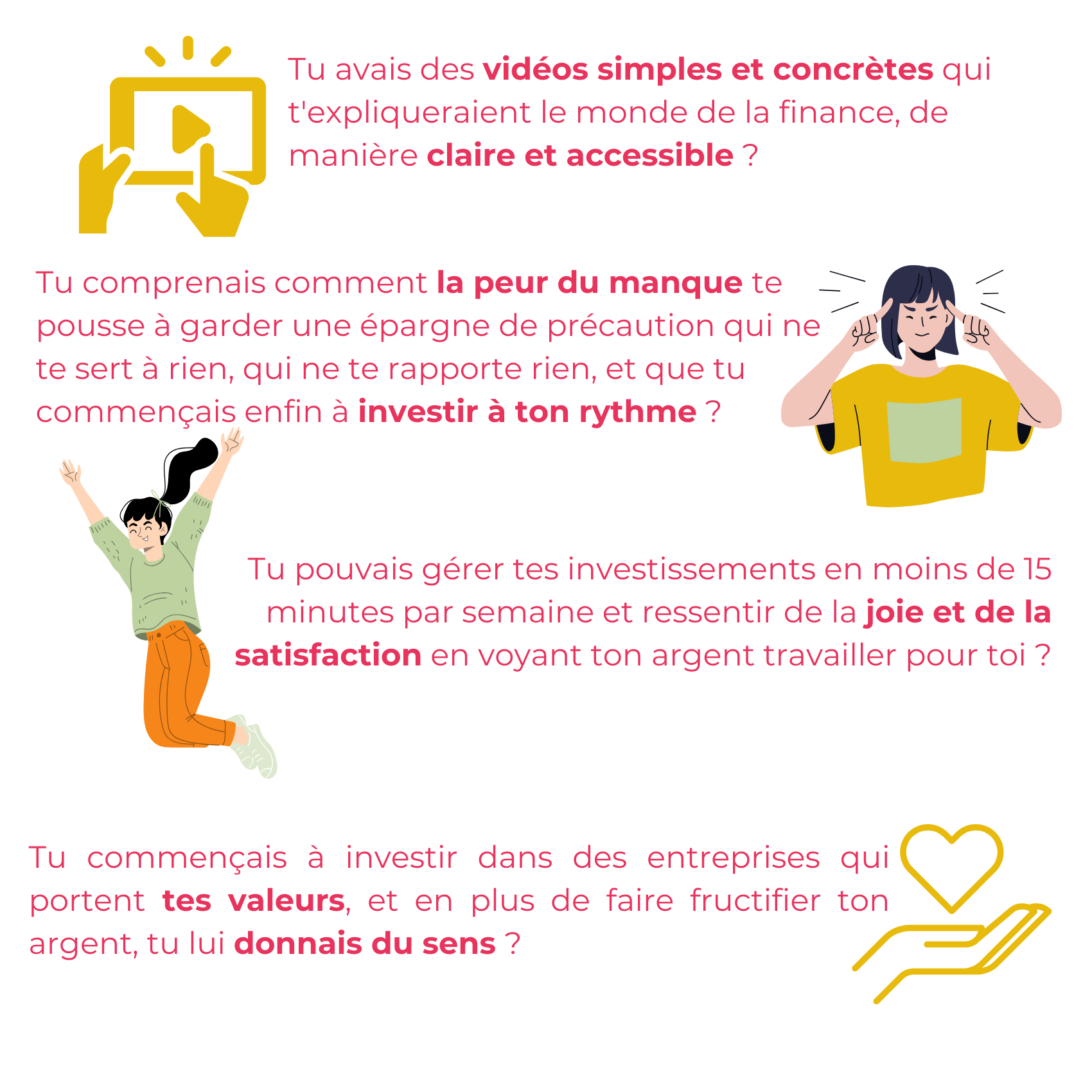 Imagine ce qui est le plus inconfortable pour toi : rester dans ta situation actuelle, sans savoir comment investir pour réaliser tes rêves, ou passer à l’action maintenant et commencer à travailler sur ton avenir financier ?