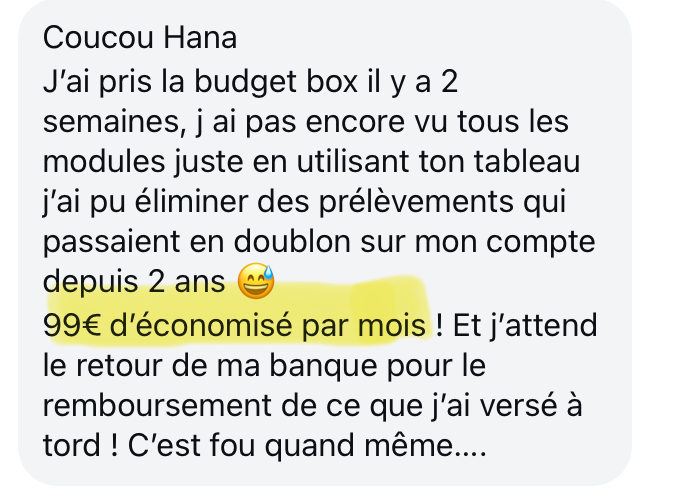 Le coeur qui battait très très fort à chaque dépense, bat en toute confiance. Je fais mes comptes de façon régulière, je regarde mon compte en sérénité même les mois de grosses dépenses. Faut juste déposer les armes et se laisser guider par Hanna. Pas de charge mentale supplémentaire. Pas de contraintes imposées. Juste une belle leçon d’éducation financière qu’on devrait avoir à l’adolescence